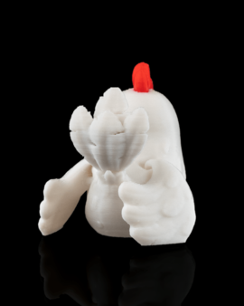 De vrolijke kip met ronde vormen en speelse uitstraling.